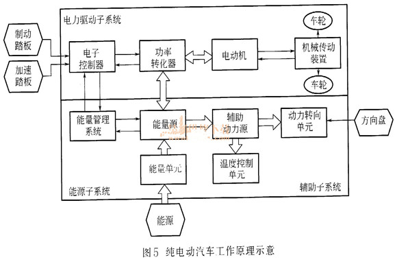 純電動汽車是由蓄電池的能量使得電動機驅動車輪前進,其工作原理示意如圖5所示。能量流動路線:蓄電池→電力調節器→電動機→動力傳動系統→驅動輪。其中,蓄電池提供電流,經過電力調節器后輸出至電動機,然后由電動機提供扭矩,經傳動裝置后驅動車輪實現車輛的行駛。